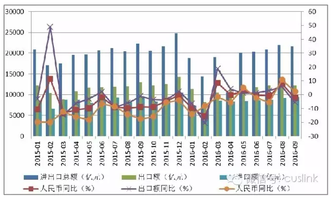 圖表 1 2015年1月-2016年9月我國進(jìn)出口貿(mào)易逐月情況對(duì)比